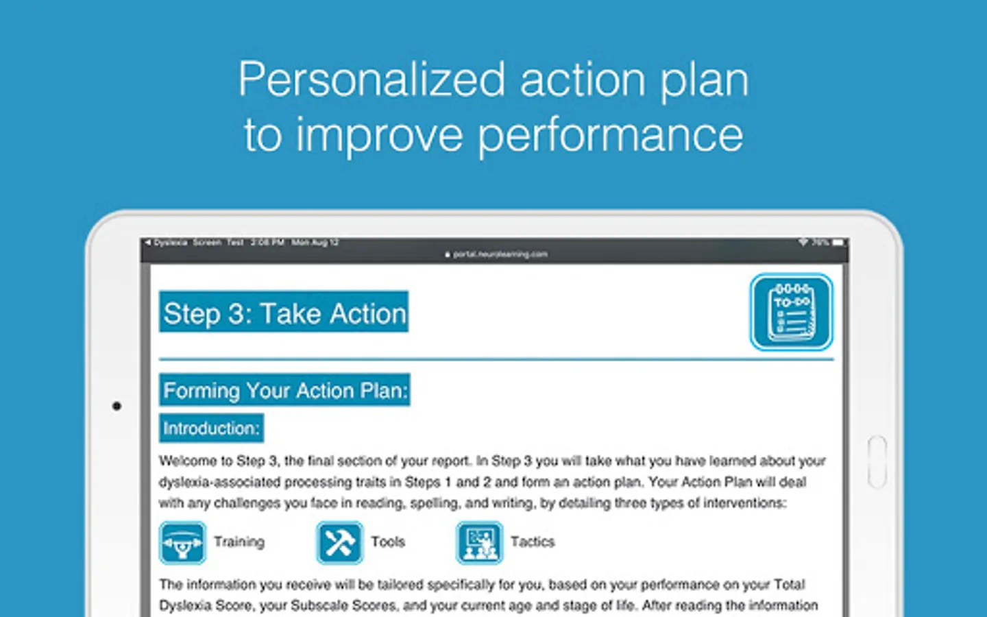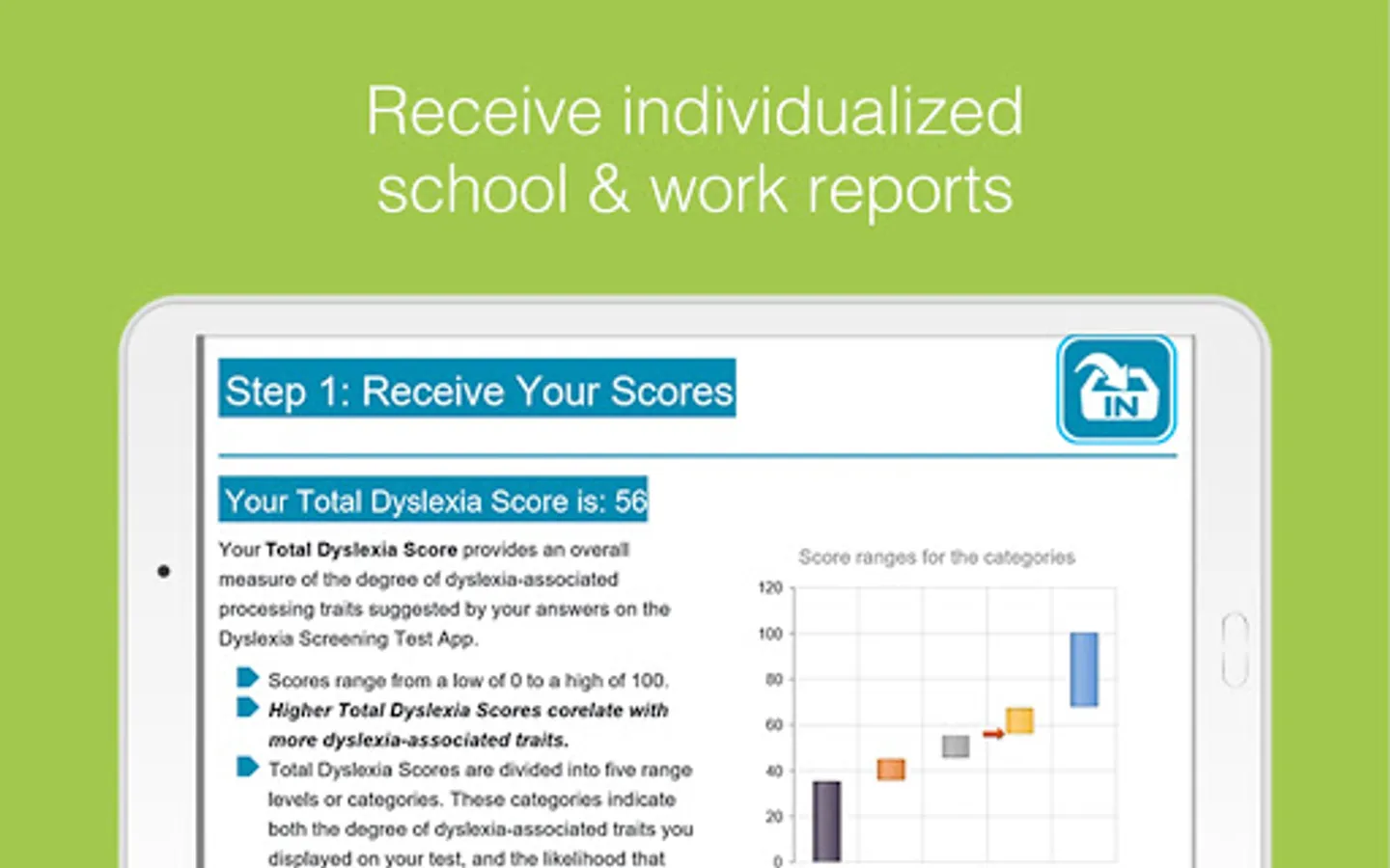The Neurolearning Dyslexia Screening Test App measures several key brain functions that underlie reading and spelling skills, and that work differently in individuals with dyslexia. It combines these measures with an assessment of current reading skills to determine the likelihood that the test user is experiencing challenges at school or work related to dyslexia. After the screening, users are provided with a detailed and individualized report of their results.