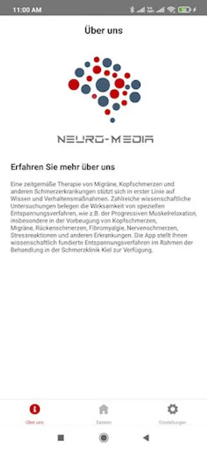 Eine zeitgemäße Therapie von Migräne, Kopfschmerzen und anderen Schmerzerkrankungen stützt sich in erster Linie auf Wissen und Verhaltensmaßnahmen. Zahlreiche wissenschaftliche Untersuchungen belegen die Wirksamkeit von speziellen Entspannungsverfahren, wie z.B. der Progressiven Muskelrelaxation, insbesondere in der Vorbeugung von Kopfschmerzen, Migräne, Rückenschmerzen, Fibromyalgie, Nervenschmerzen, Stressreaktionen und anderen Erkrankungen. Die App stellt Ihnen wissenschaftlich fundierte Entspannungsverfahren im Rahmen der Behandlung in der Schmerzklinik Kiel zur Verfügung.