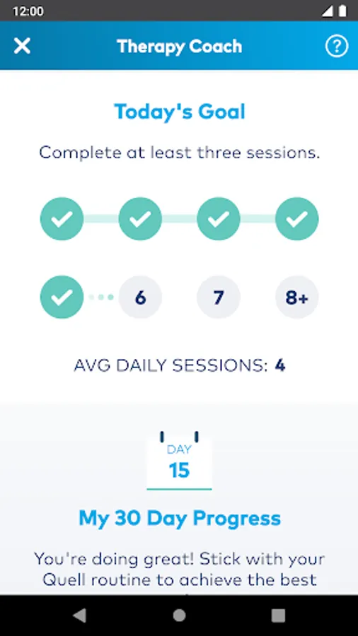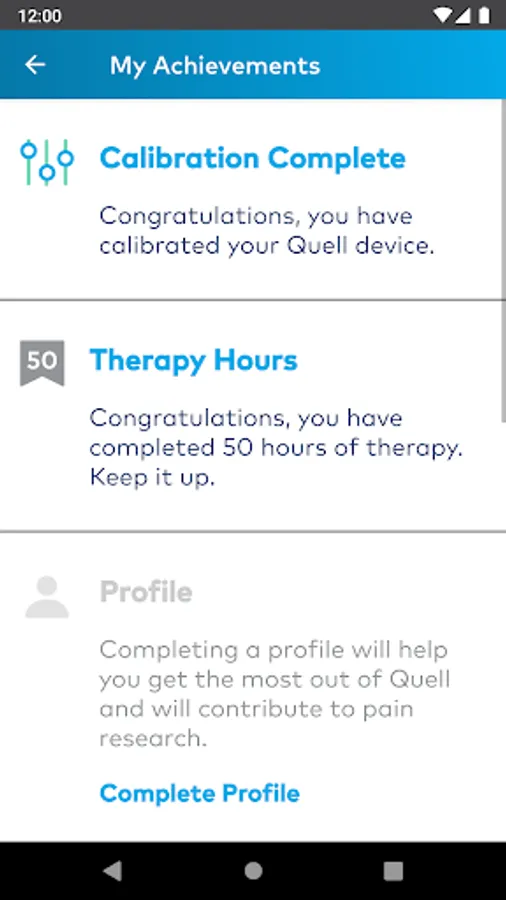 This is the Quell Relief app, designed for advanced personalization and control of your Quell device. Utilizing Bluetooth® Smart technology to connect your Quell to your smartphone or tablet, you can control your device and track your therapy, sleep, pain levels, and activity.