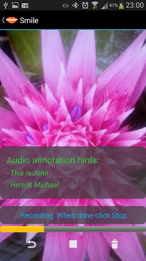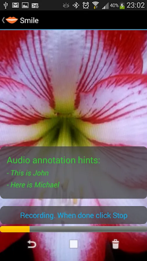 Smile is a camera and picture gallery application that helps you to immediately voice-tag or annotate your photos, and add the information as metadata. Smile will then automatically extract the text (annotation) from the speech using speech recognition technology and will embed the text annotation and the speech as meta data inside the picture. This way you have full text about the picture, as metadata. So if you are searching for a picture in the hundreds of pictures you have on your phone, you can find them easily using Smile's Search facility. Even more, with Smile you can share the photo with friends, with or without the speech and text. Your friends or colleagues can see the picture (if they don't have Smile), and with Smile they can see the picture, the text and listen to the speech. Great for fun, quick greeting photos, work if you need to take photos with record, expense receipts, and many more uses.