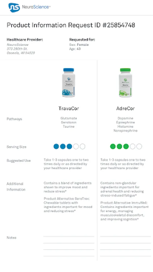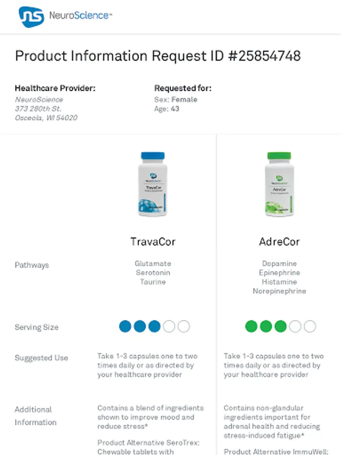All PIRs outline the relevant pathways, serving size, suggested use, key ingredients, and additional information for the selected product(s). The NeuroScience website stores PIRs, allowing providers to easily search and view their PIRs in a convenient and secure location.