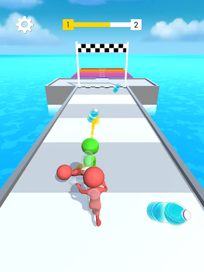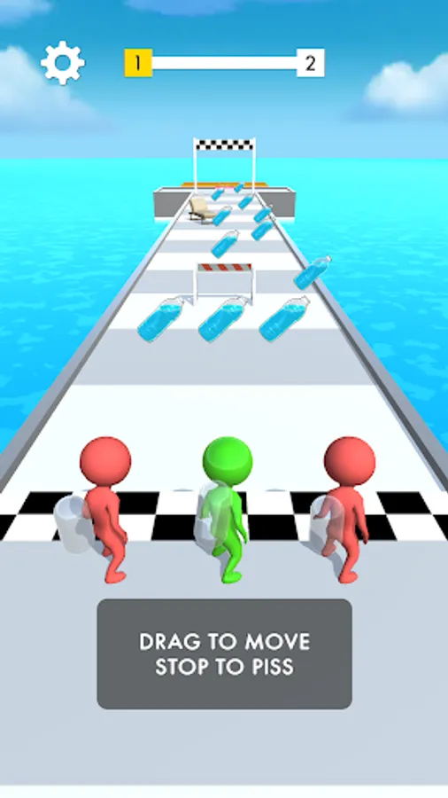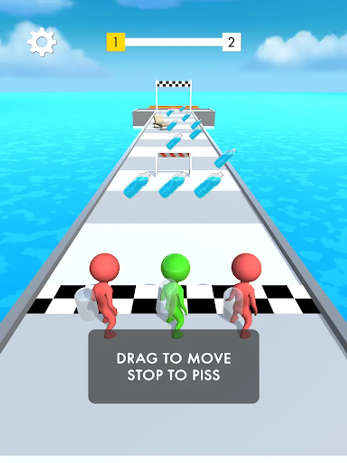 Run and piss forward to knock down opponents and come first. Pick up water bottles and piss as long as you need