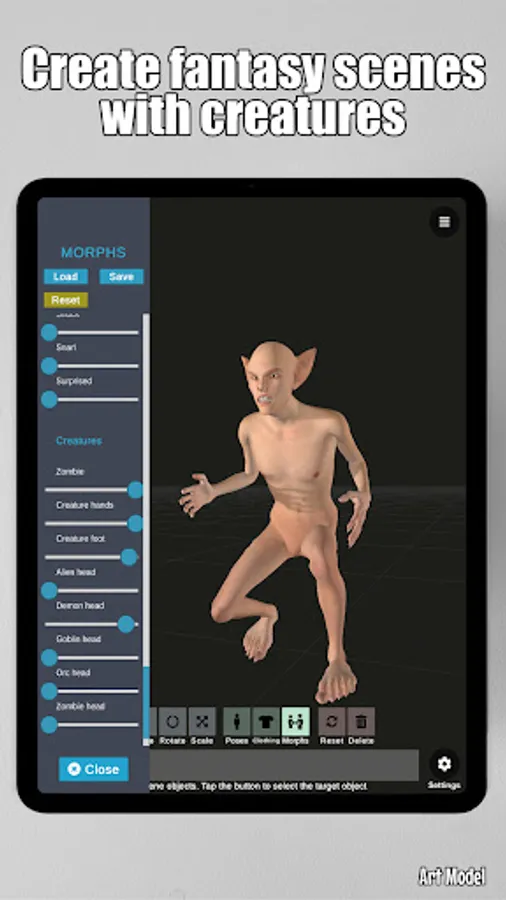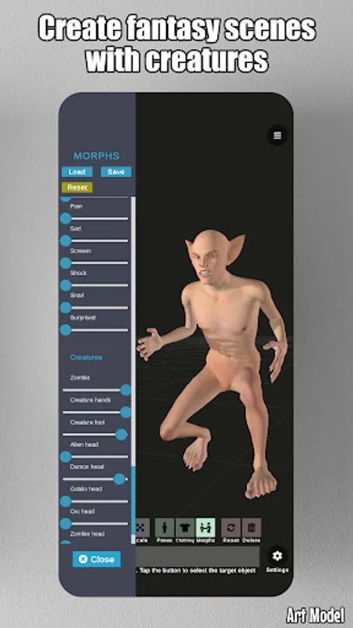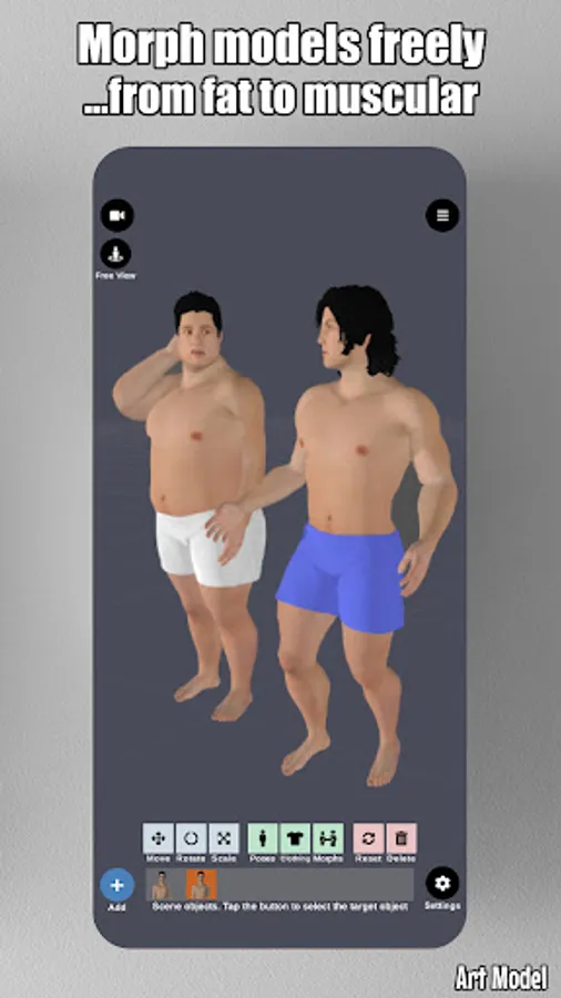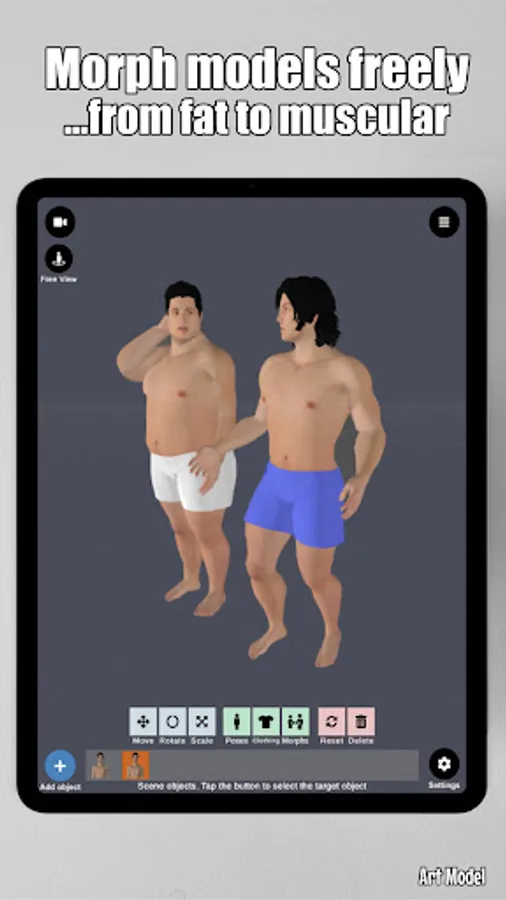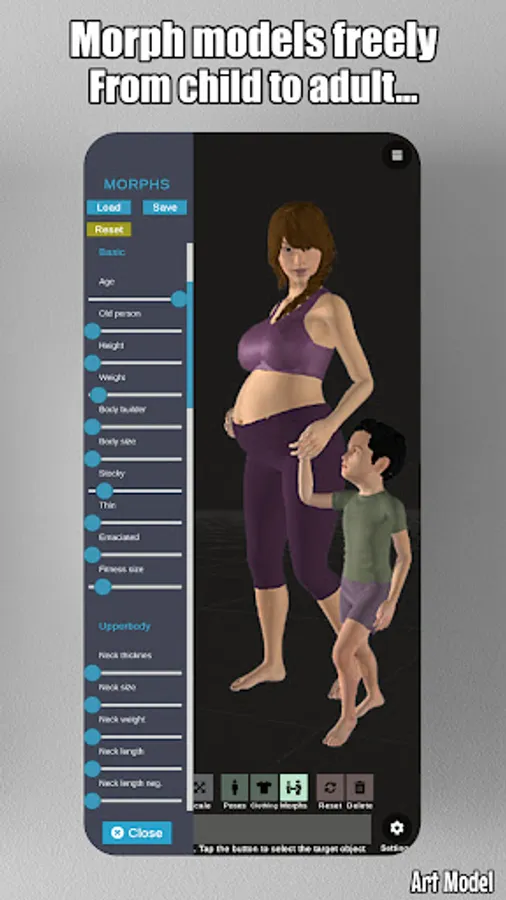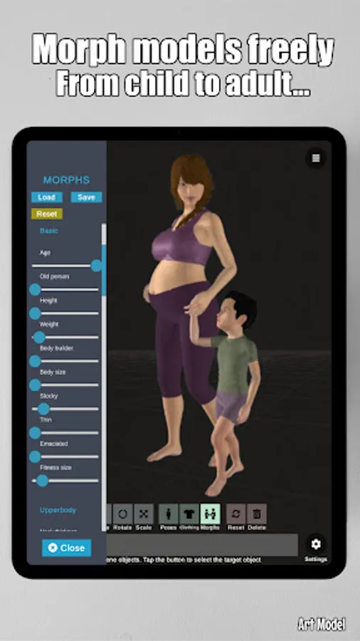 Art Model is also a powerful morph tool. Morphing system gives you the ability to create an unlimited range of unique models. You can transform your model from child to an adult, skinny to muscular or make it fat, pregnant, creature etc.