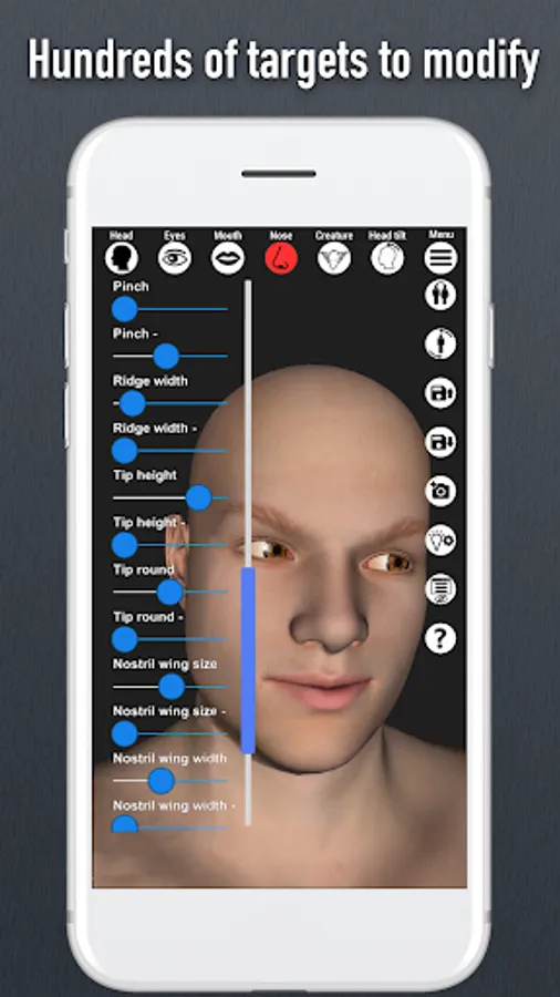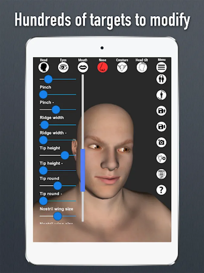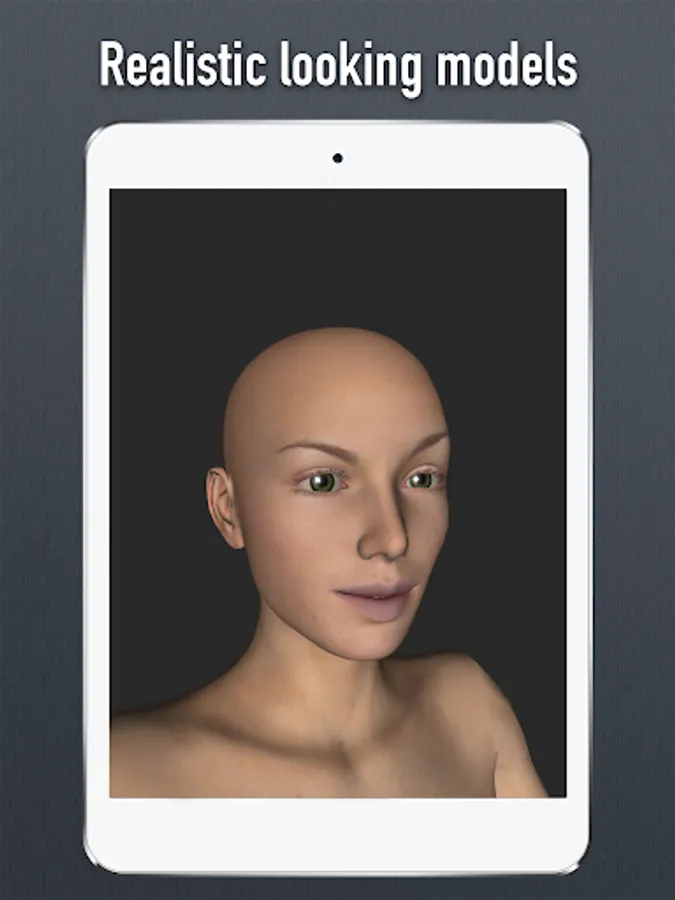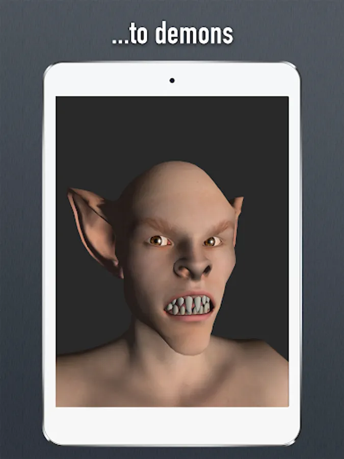 Ground-breaking and only 3D head pose tool for the Android with full face and head morphing capabilities. Hundreds of customizations to play with. Modify shape and size of the head, eyes, nose and mouth. App comes with realistic looking 3D male and female model. There are 17 pre-made facial expressions and 20 pre-made creatures (Aliens, demons, goblins, animals, zombie...)