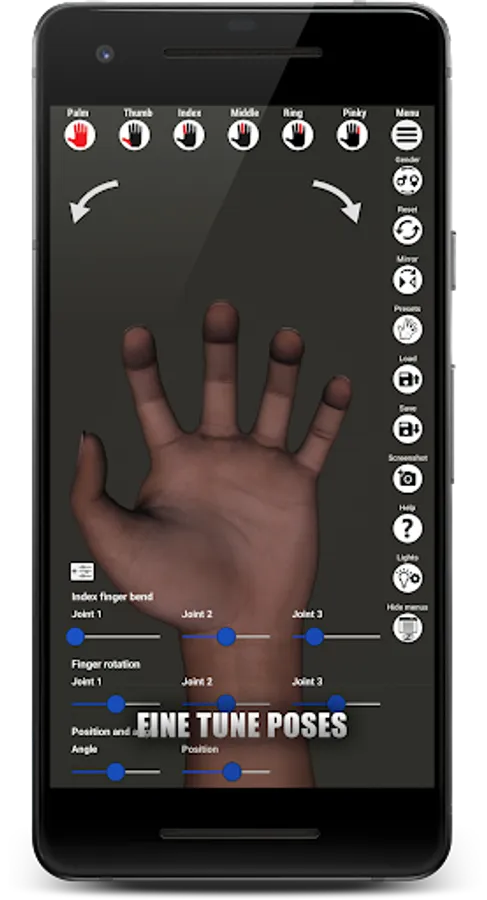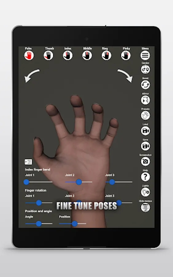 With Manus app you can rotate, bend and set distance of every finger to get that pose you are looking for. With flexible camera controls you can pan and rotate hand model freely to examine pose from any angle.
