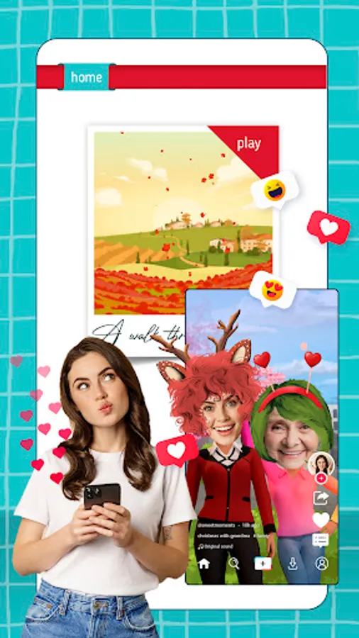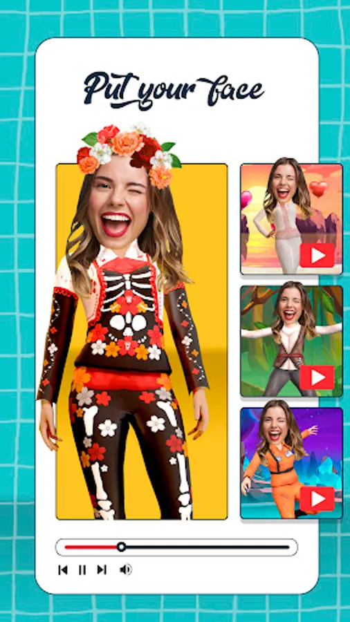 Create your avatar using photos from your gallery or make it on the spot. And the funniest with the faces of your pets! Choose between different backgrounds or scenarios, add one of the best songs in history and generate a video that you can save or share and get many likes. This app allows you to put your face in personalized videos in a very simple way where your face will appear in the funniest and strangest places. You can become a dance star in your own personalized video. You will not leave anyone indifferent.