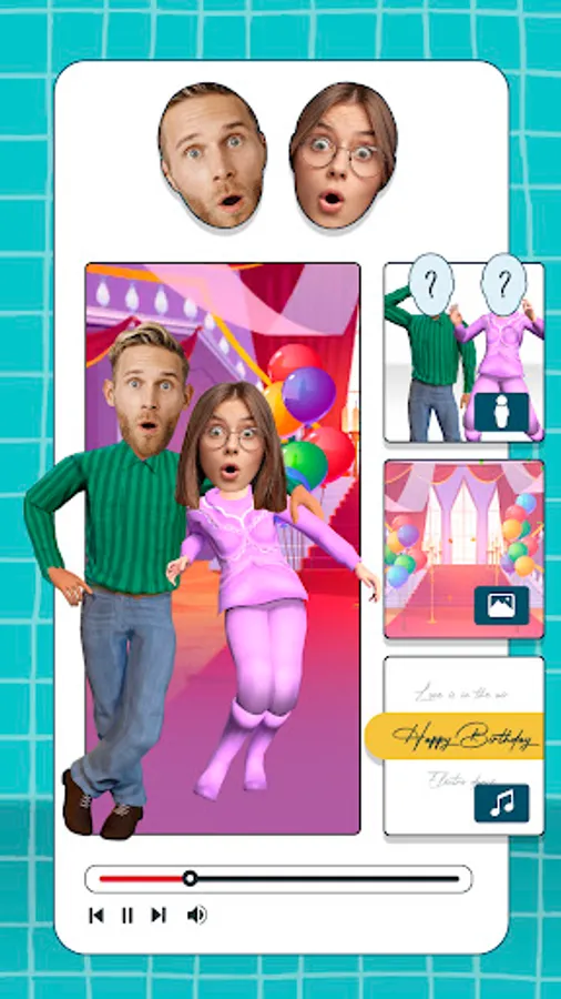 Choose your favorite scene, dress your avatar with the most extravagant accessories and become a dancing star. Create the best prank videos with your face and succeed on your social networks.