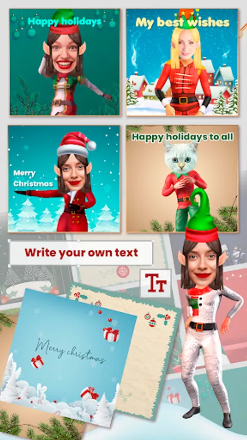 Congratulate Christmas in a fun way and surprise your loved ones. We offer you different options for your craziest Christmas greeting: Put your face on Santa Claus, an Elf, a reindeer or snowman and show it from your own camera in real time. You can also choose a background and write your own Christmas message on the videos. Add the Christmas carol or Christmas music you like the most. You will have a dancing video while a snow effect falls behind you. Save, share… this video is yours!