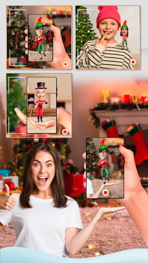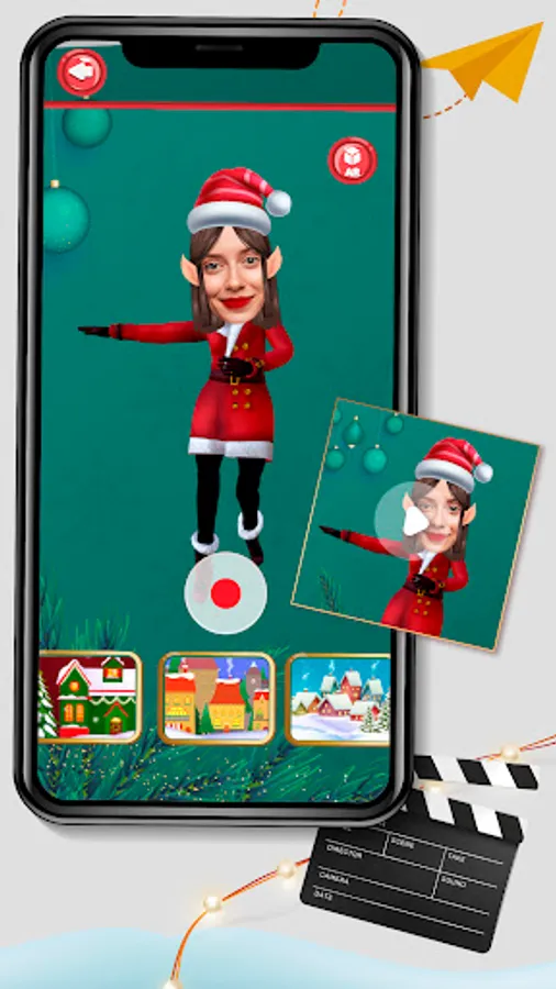 Transform yourself into a 3D Christmas character and dance to celebrate Christmas, New Year's Eve and New Year's Eve. Become a celebrity and send a dancing video to all your loved ones. Select the background where you would like to dance - it's showtime!