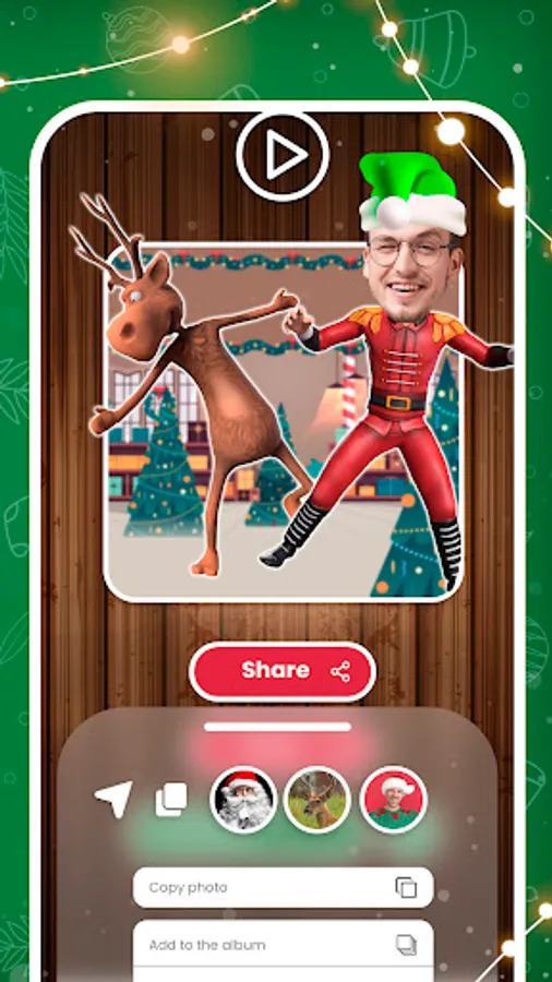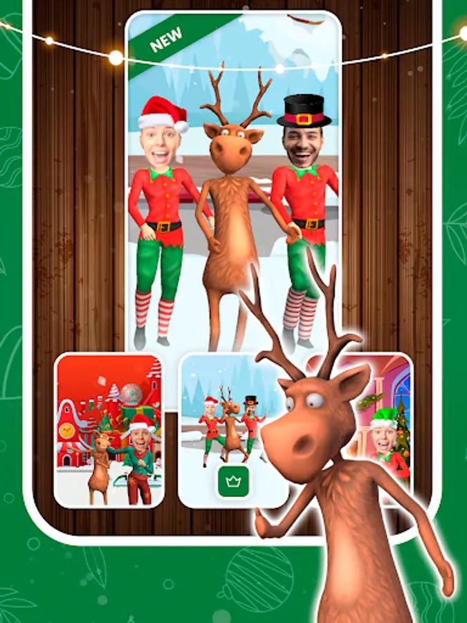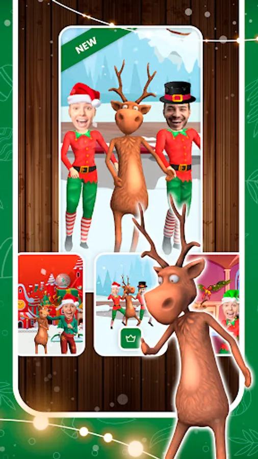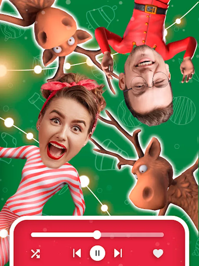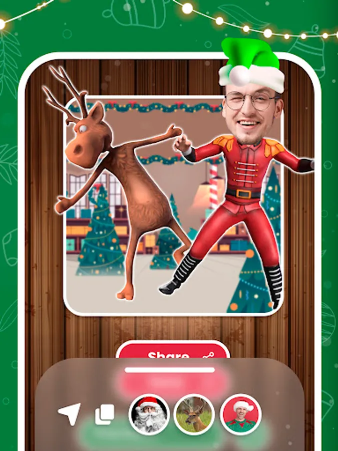 Select the best dance theme and get ready to do the traditional elf dance with Santa Claus or the Elves. Bring joy and live the Christmas spirit. Put your face on a 3D model. Place it onto the elf or Santa Claus. Discover various funny dances. Select between 10 original backgrounds. Record your character dancing and share it.