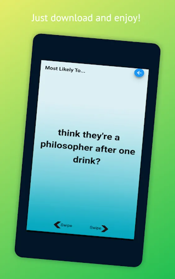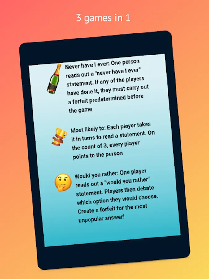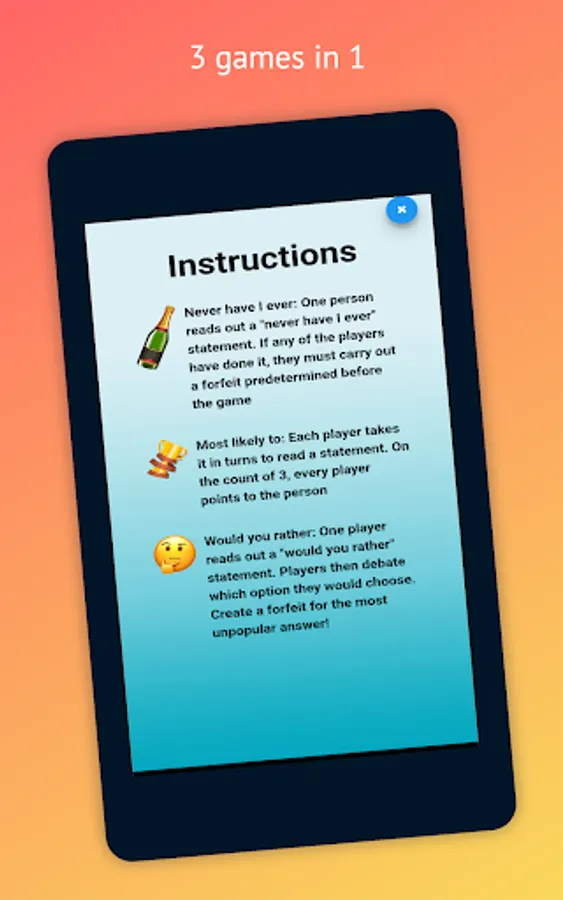 Keep family and friends entertained with the Big Quiz Master’s 3-in-1 Drinking Game. The downloadable app has an easy-to-use interface offering three popular, playable games, including Never Have I Ever, Most Likely To, and Would You Rather. Each game includes brief yet detailed instructions to ensure everyone knows how to play and follows the rules to prevent confusion. If you want to laugh like never before, this app is a must-have.