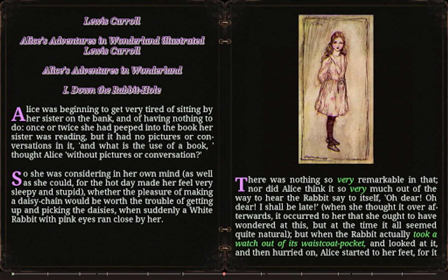 - Navigation in the text: by percents, by pages, to the beginning/end of the text, 10 pages forward/backward, to the next/previous chapter.