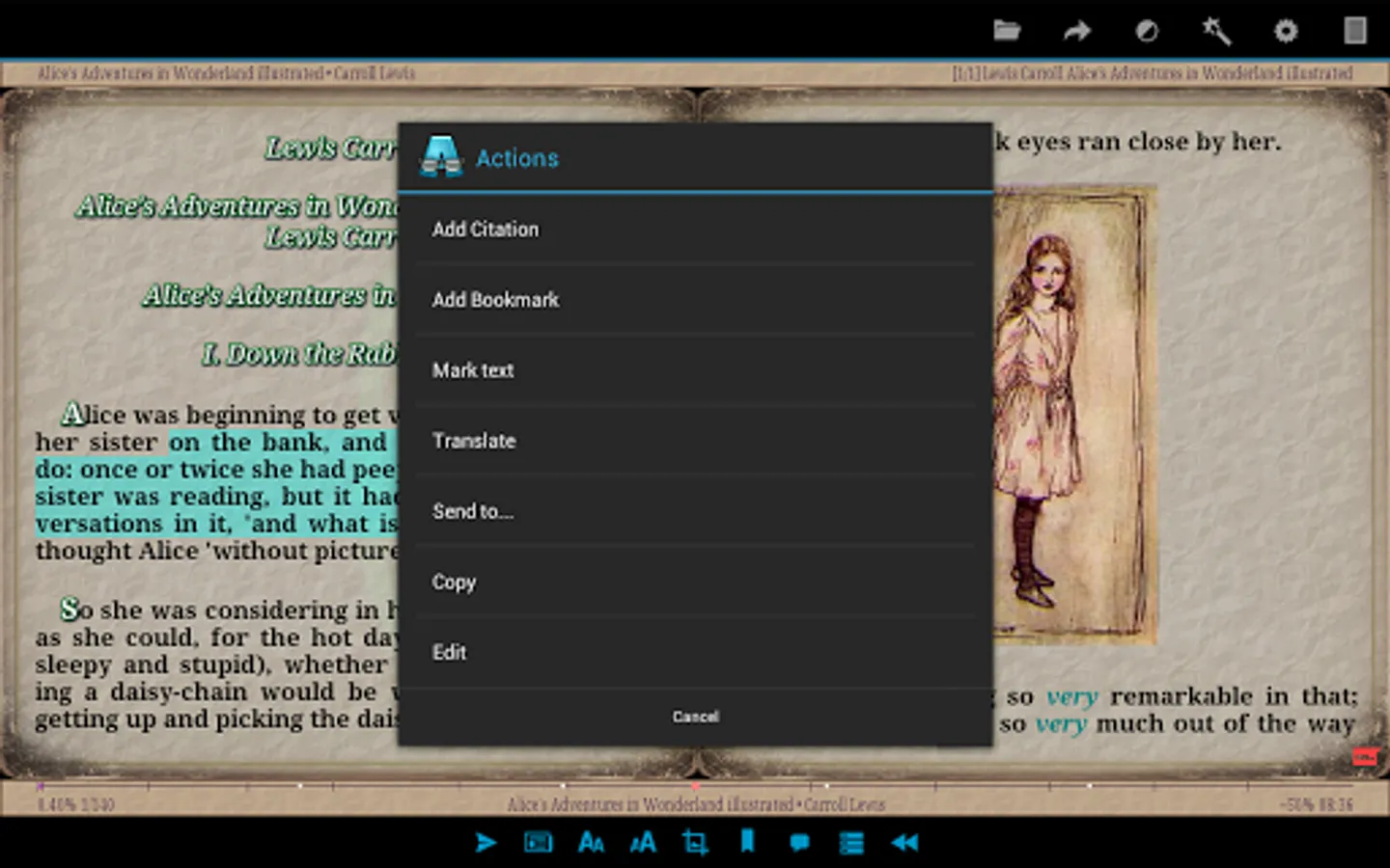 - Quotes, bookmarks, text labeling, sending the selected text to third-party programs.