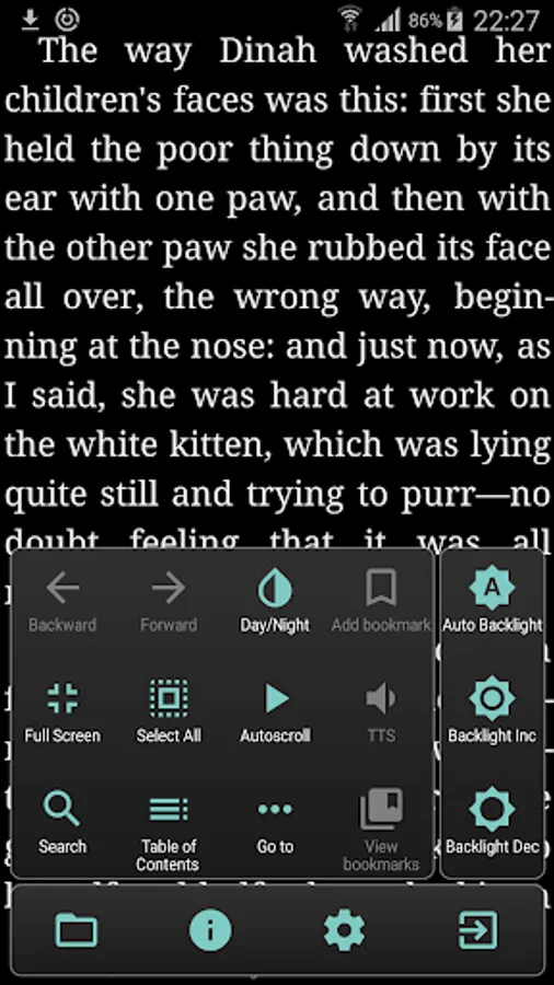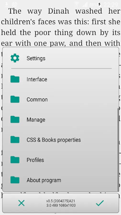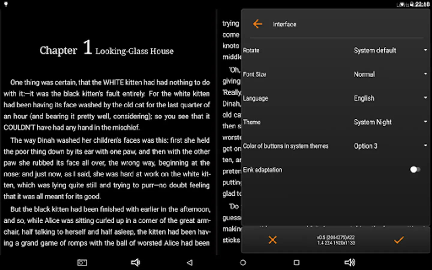 You can use external dictionary for translate words and sentences. You have the opportunity to correct typos in fb2 and txt files. The application can arrange hyphenation in 20 languages. Day / night profiles are available for comfortable reading at any time of the day. Custom font settings. Custom color settings. One- and two-page mode with automatic switch to the two-page mode in landscape. OpenGL paging animation. Autoscroll "wave". Navigation in the text: by percents, by pages, to the beginning/end of the text, to the next/previous chapter. 9 tap-zones for short and long taps, gestures, gestures with two fingers, resize text by "pinch", to assign the actions for buttons.Clock behind the text. Ability to hold screen backlight (up to 10 minutes of inactivity). Synchronize reading position via network or file system.