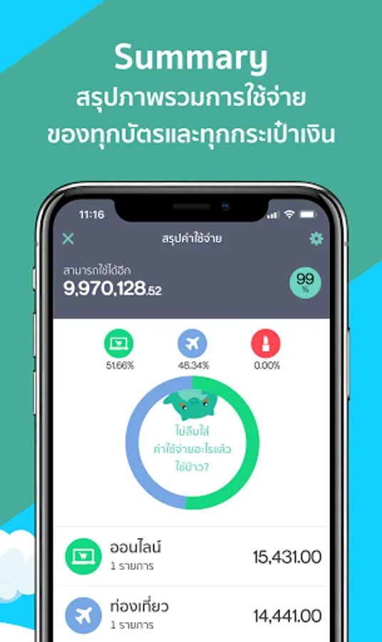 - มี Summary สรุปภาพรวมการใช้จ่ายของทุกบัตรและทุกกระเป๋าเงิน แบบเข้าใจง่ายด้วยกราฟวงกลม