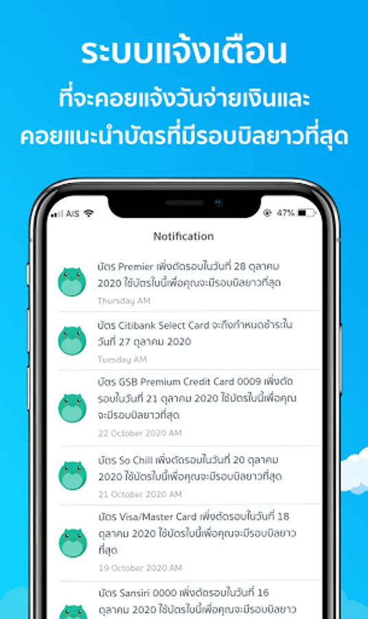 - มีระบบแจ้งเตือนที่จะคอยแนะนำว่าควรใช้บัตรใบไหนที่จะต้องจ่ายจริงอย่างช้าที่สุดได้