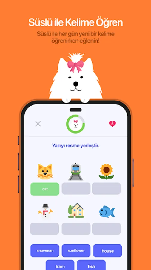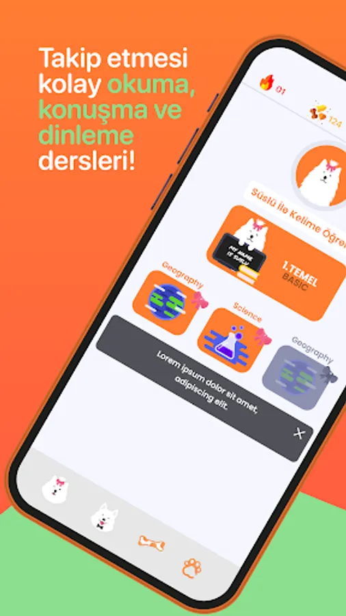 Three adorable Samoyed dog characters! These characters make the language learning experience of the users more fun and interesting.