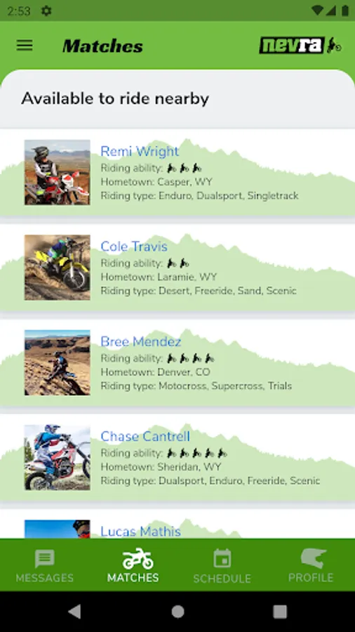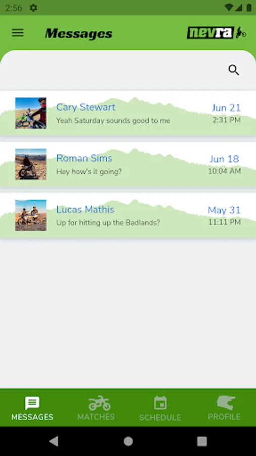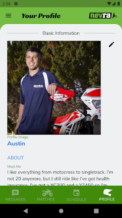 Whatever your reasoning, NEVRA is the answer! NEVRA seeks to grow the off-road motorcycle industry by connecting like-minded users with a common interest based on schedule availability, location, skill level, and more. The name says it all; NEVRA comes from "Never Ride Alone." Safety is our first concern and it is our goal to make sure that you've always got someone with you when you're at the track or on the trail. We know you want to ride and we know it's your passion.