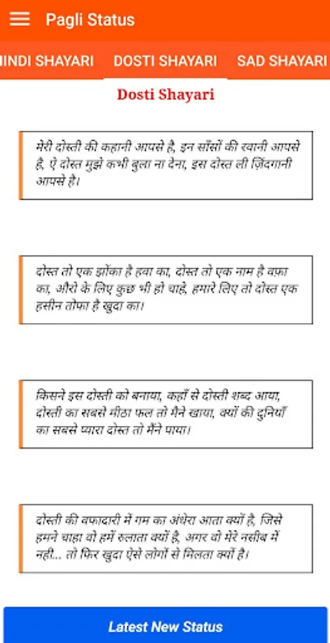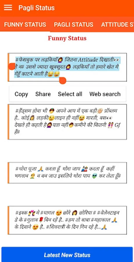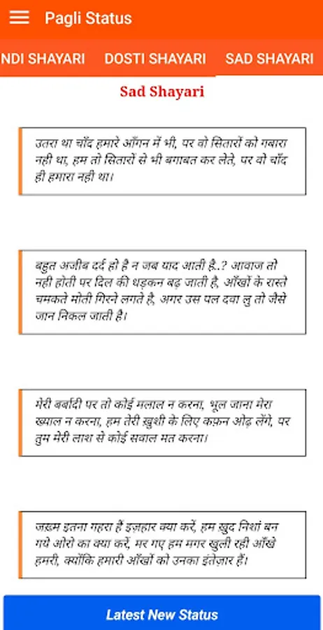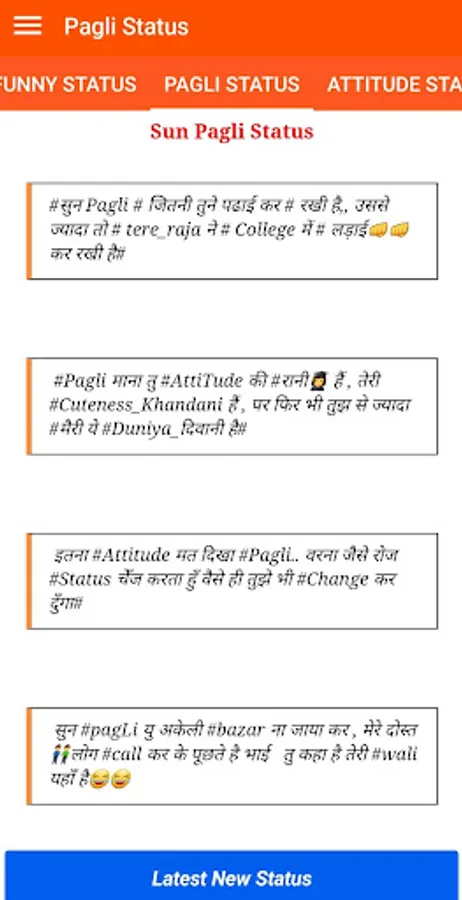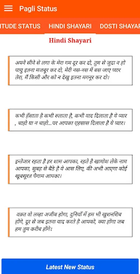 This is a pagli status app and In this app available is unlimited status and shayari in hindi. In this app you can easily copy & paste the status that you like, and easily share the status anywhere.
