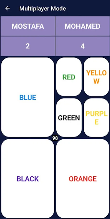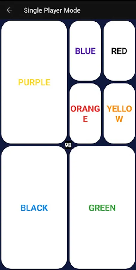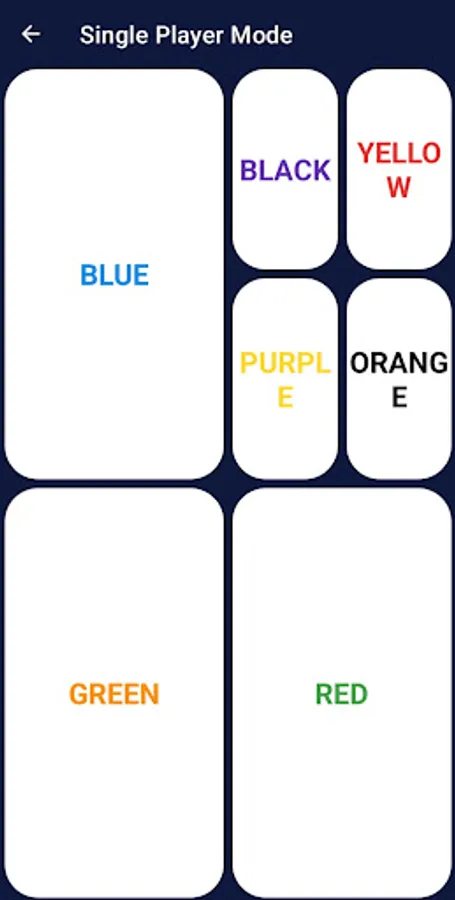 Each text is a color name where all texts all colored with a color different from the color represented by text except only one text which it's color is the same as the text