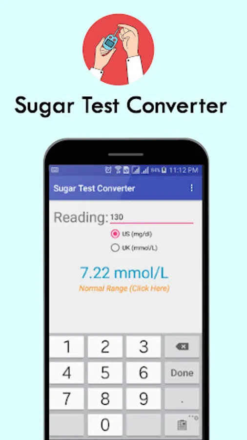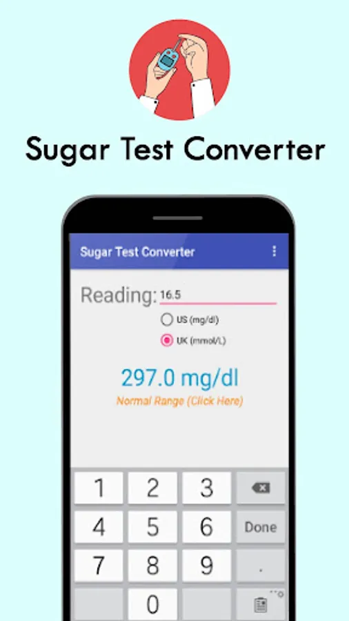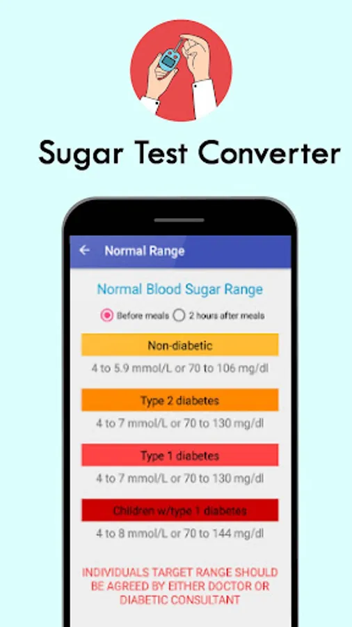 Sugar Test Checking App information stores your blood sugar values and does not measure your values. The values and graphs are only for illustration purpose of blood sugar readings.