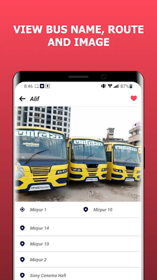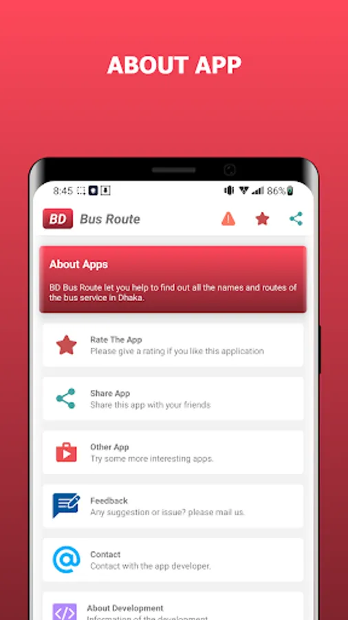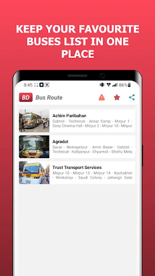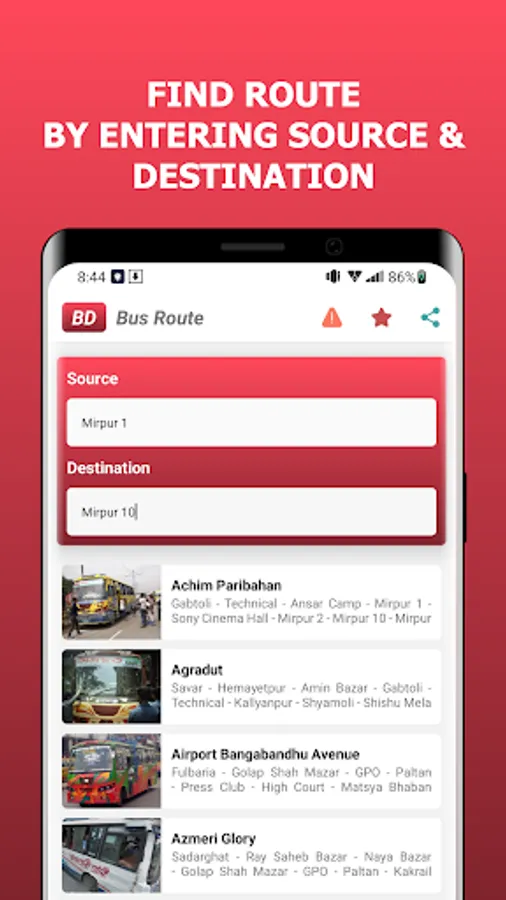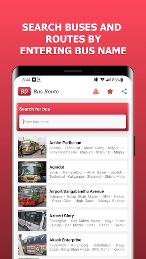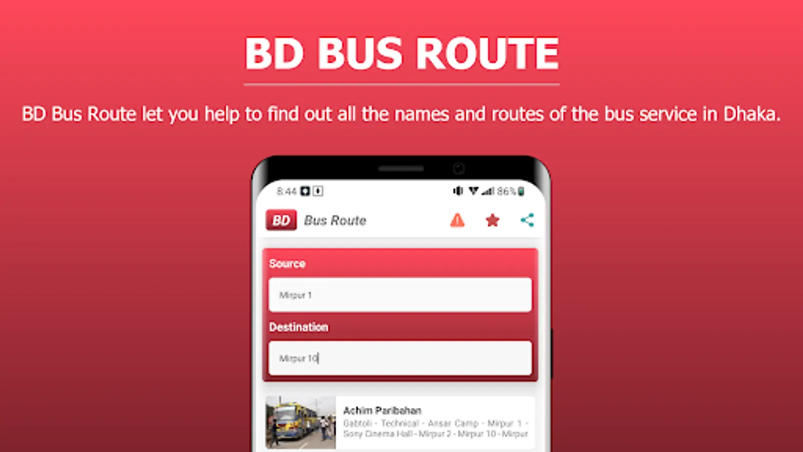 In this app, you will get the list of all the Dhaka city buses with routes. If you stack in a new place and you do not know how to go to the destination than by using this application you will easily identify the exact bus for your destination.