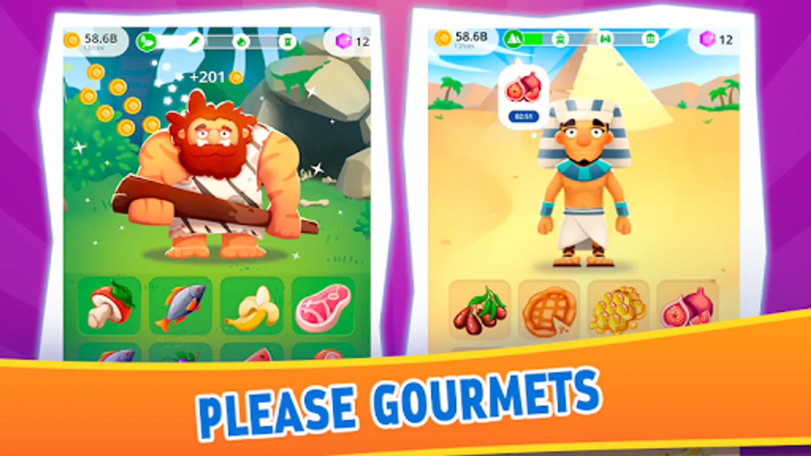 If your caveman satisfies his hunger, he will develop recipes and evolve to a new age. Can you please this foodie human? Evolution needs you! Discover all recipes, improve dishes and lead the human race to the future.