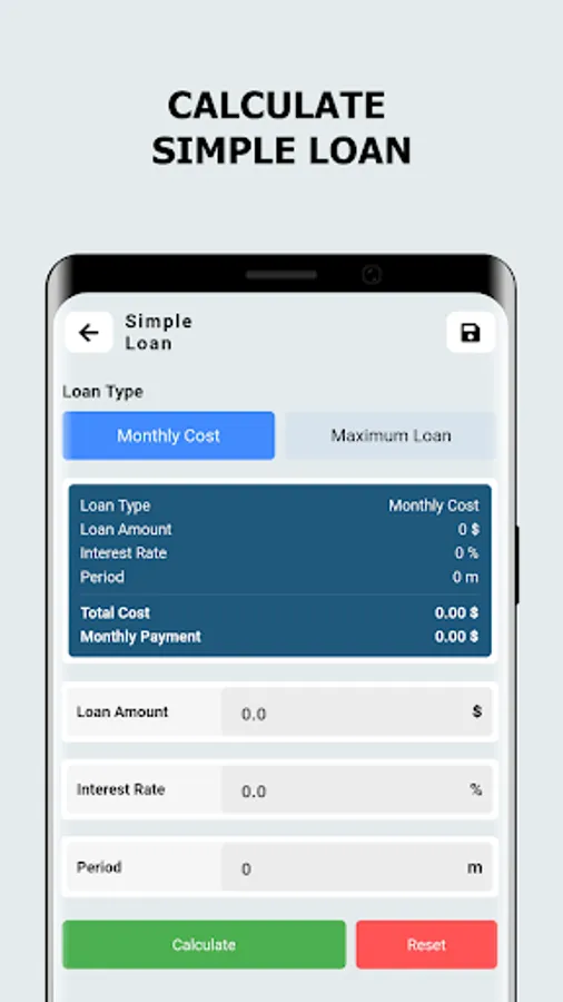 • You can calculate the total cost and monthly payment by entering the loan amount, interest rate, and loan period.