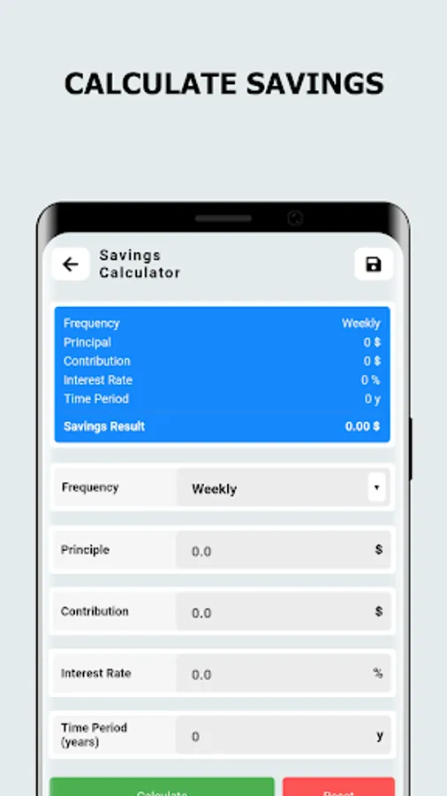 • Calculate savings with selected frequency by entering principle amount, contribution price, interest rate, and the time period in a year.