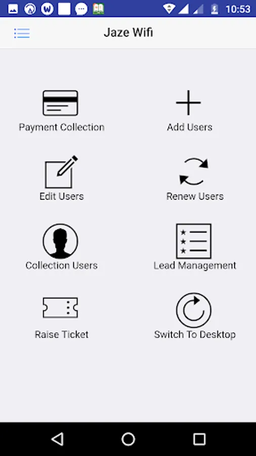 Admin can view all users,renew,add FUP,collect payments,raise ticket for customers,respond to complaints,add users.