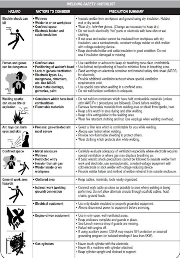 Welding tips and guides. Basic weld symbols, general data, weld joints, bench design, processes, welding safety, polarity chart and settings.