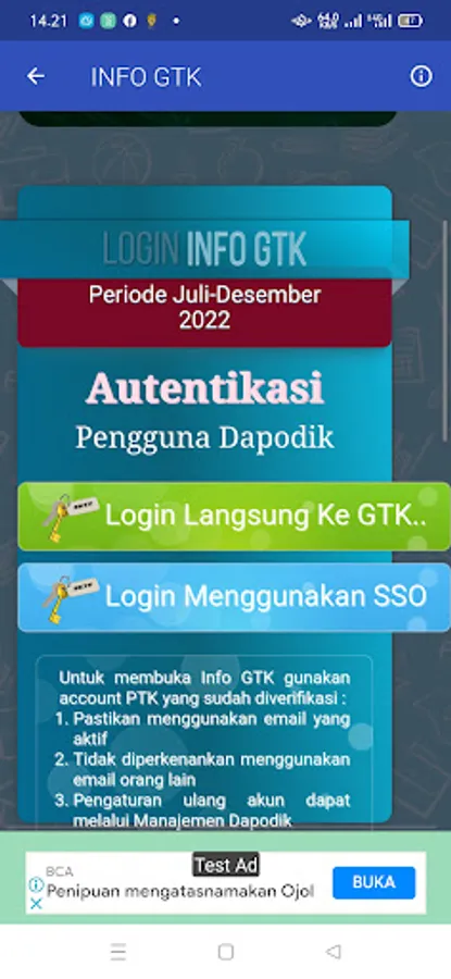 2. Another way that can be tried is using the PTK Account method. However, to do so, you must log in to GTK Info using the PTK User ID and password that is in Dapodik.