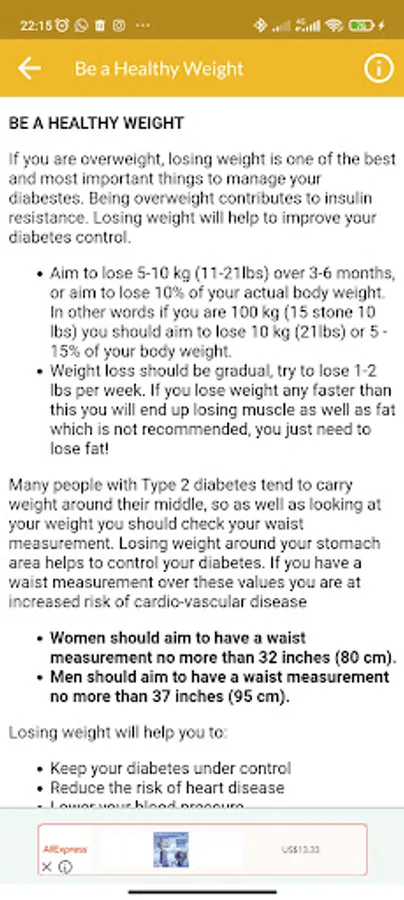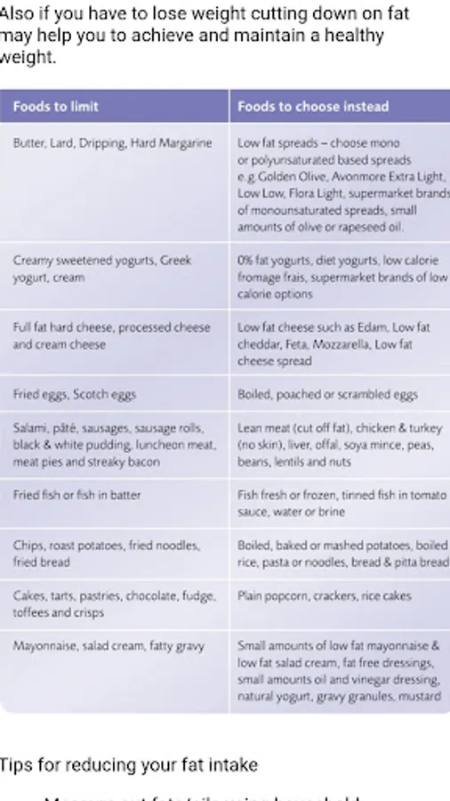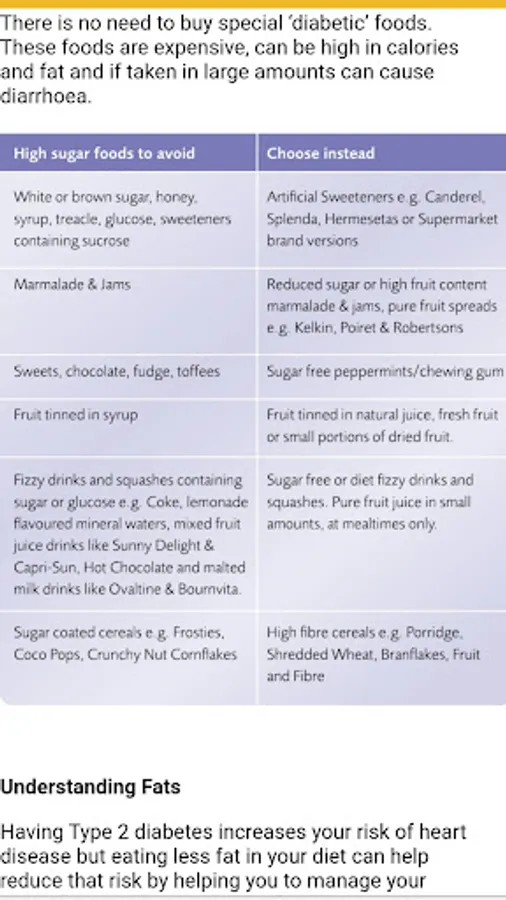 This app contains examples of high sugar foods to avoid and suggestions for healthy alternatives, foods to limit and foods to choose instead in order to manage and keep blood sugar level in control