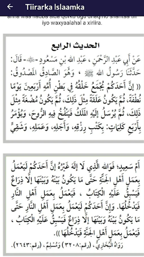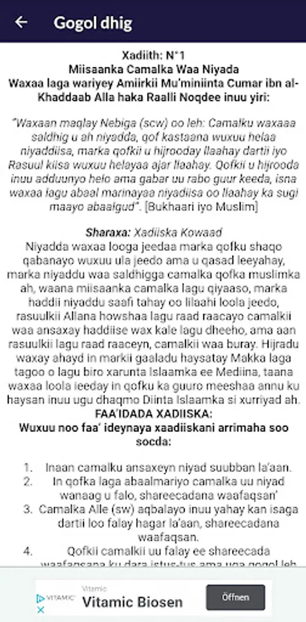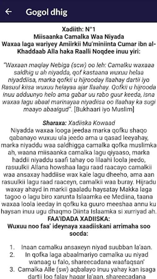 Mahad Allaa leh, naxariistii iyo nabadgelyadii Alle ha ahaadeen Nabigayagii Muxammad kor kiisa, ehel kiisa, asxaab tiisii iyo intii samaanta ku raacday ilaa maalinta qiyaamaha. Waxaynu ogsoon nahay in labada asal ee loo noqdo si loo fahmo diinta Islaamka , saldhiggana u ah nolosha qofka muslimka ahi inay yihiin Qur’aanka kariimka iyo sunnada dahiran ee nebiga (scw). Midka hore ee ah (Qur’aanka) waa hadalkii Allah (swt); midka labaadna oo ah sunnada ama xadiiska nebiga hadba kan loo yaqaan wa tusaalooyinkii nebiga (scw) ee waajibka ah in la raaco, siduu Allahii casiiska ahaa yiri: