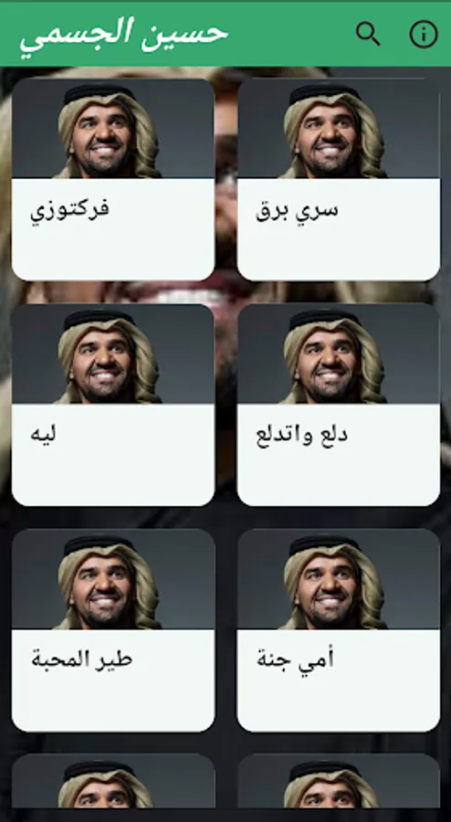 Through the application, you can listen to the songs of the artist Hussein Al Jasmi, the most famous of which is the song “Fructoozi, Dala’a, and Etdala”.