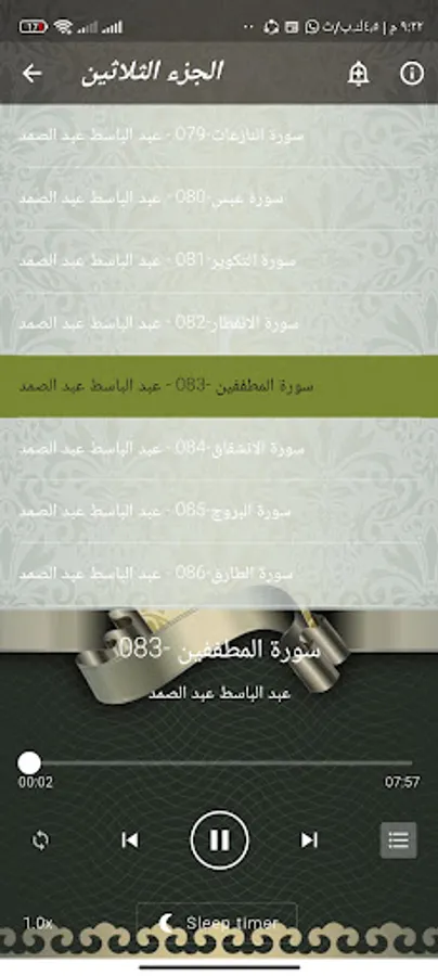 Juz Amma with the voice of Abd al-Basit Abd al-Samad mp3 without the need for the Internet. You are now listening with recitation and a very high quality of listening to the thirtieth part of the Noble Qur’an with the voice of the reciter Sheikh Abd al-Basit Abd al-Samad. You can also listen to the surahs of the Qur’an within the application with ease and smoothness. The surahs and their numbers Download now the application of the Qur’an without the net by Abdul Basit Abdul Samad, Part Amma / Part Thirty