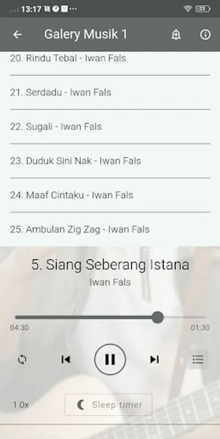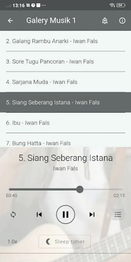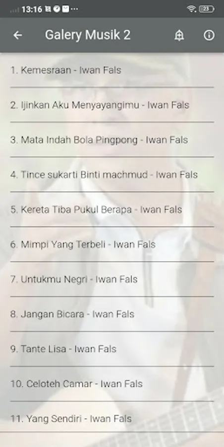 This application provides music offline. There are 50 song titles from Iwan Fals that exist. Hopefully it can be entertaining and useful for song lovers. That is all and thank you
