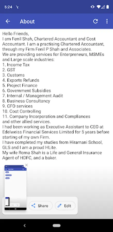 My wife Roma Shah is a Life and General Insurance Agent of HDFC, and a baker.
