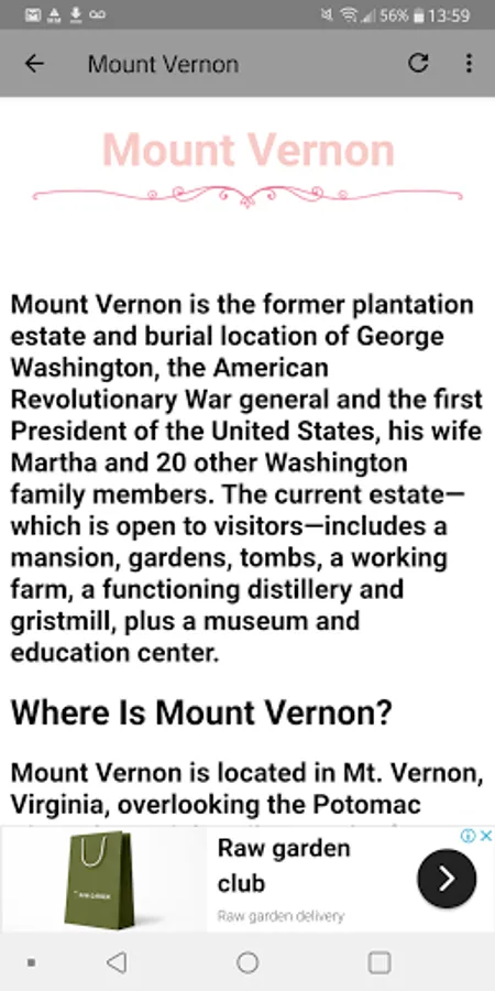 In this app you will find information, fun facts and videos about Mount Vernon.