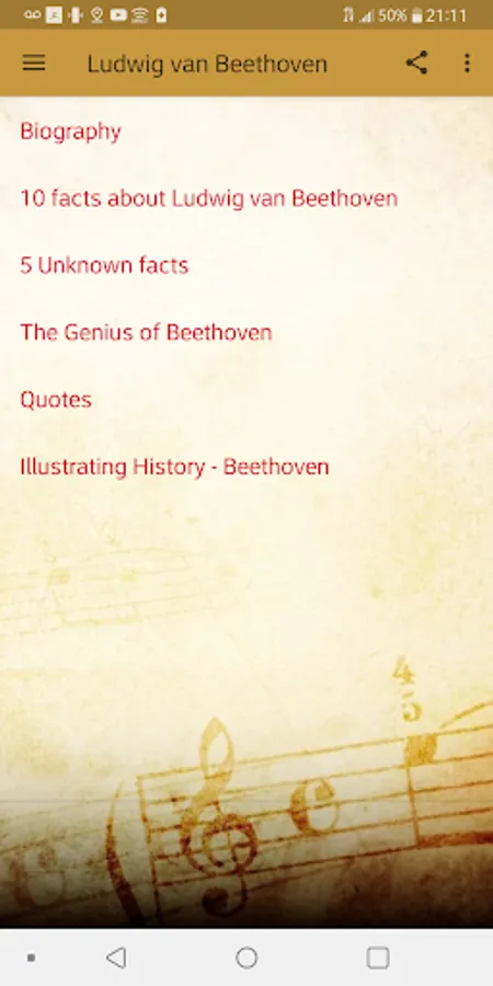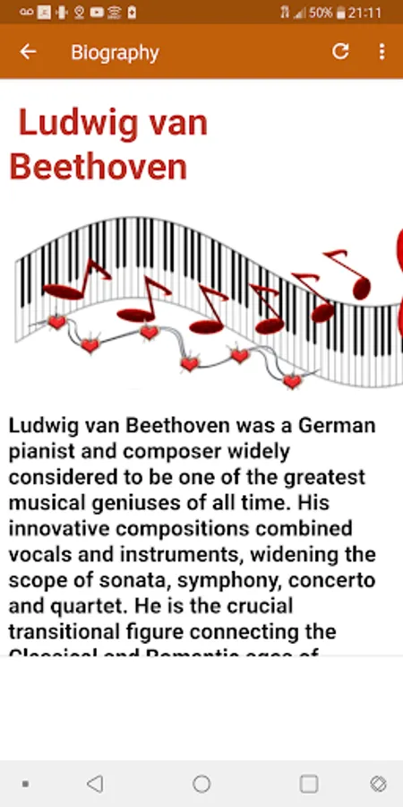 In this app you will find biography ,fun facts ,quotes and videos about Ludwig van Beethoven .