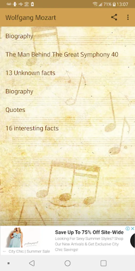 In this app you will find biography ,fun facts ,quotes and videos about Mozart .