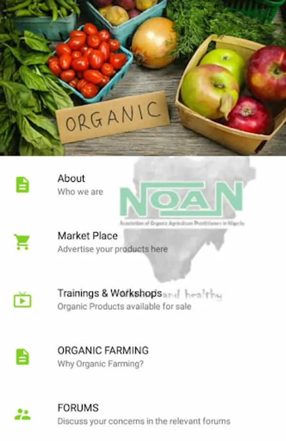 This app is for members of Nigerian Organic Agriculture Practitioners. It's also available for use by anybody with interest in organic agriculture. Organic agriculture is knowledge intensive and it becomes necessary for farmers to have information available and readily accessible to them. New and improved methods of farming continue to surface and solutions to daily issues encountered in organic farming continue to be discovered. It is therefore necessary for the emerging information to be curated and made readily accessible to the farmers. This app is aimed at achieving these objectives.