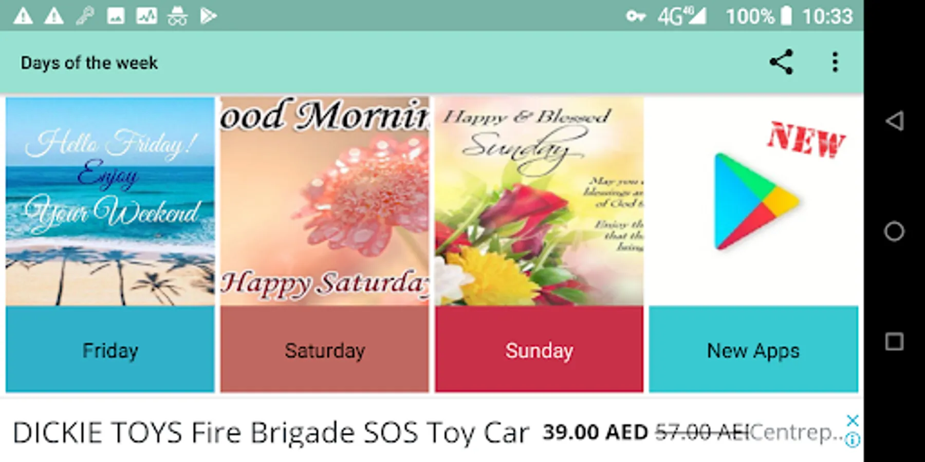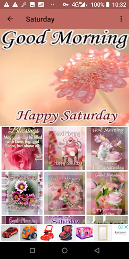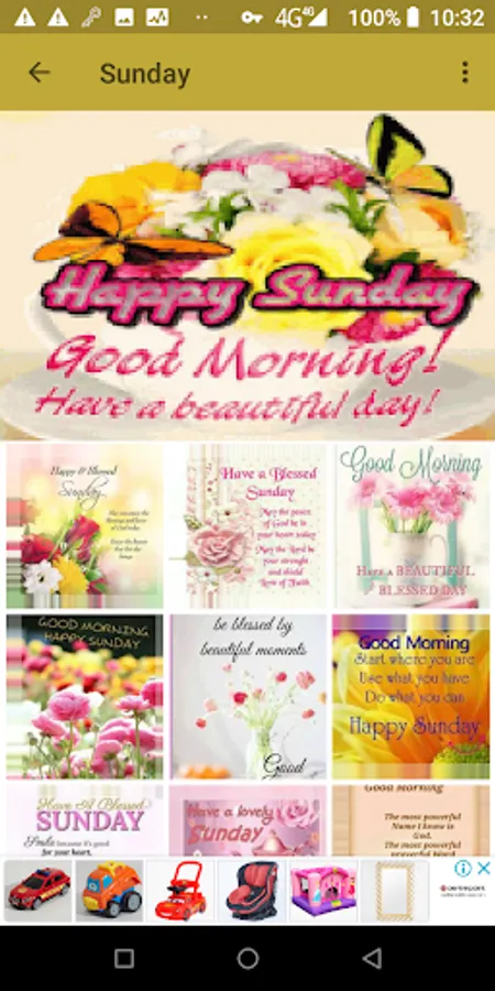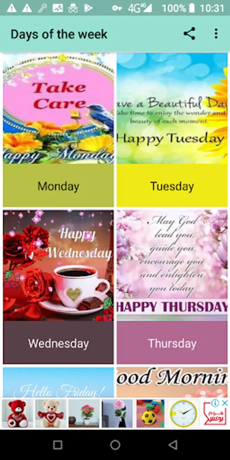 In this app you will find: Happy Day, Monday, Tuesday, Wednesday, Thursday, Friday, Saturday, Sunday. You can also find greetings from good morning afternoons and nights, the maximum variety of pictures of the week completely free of charge.