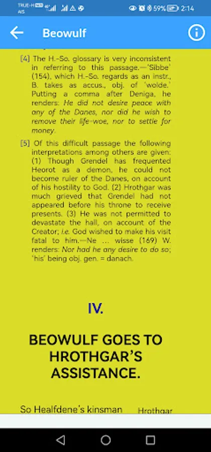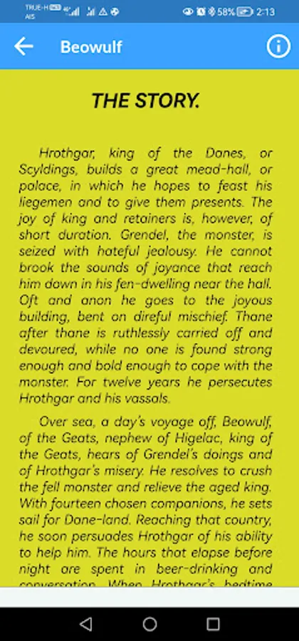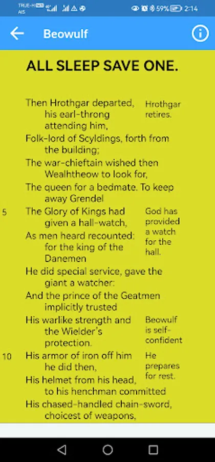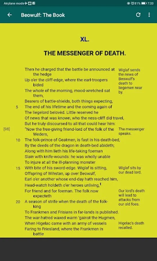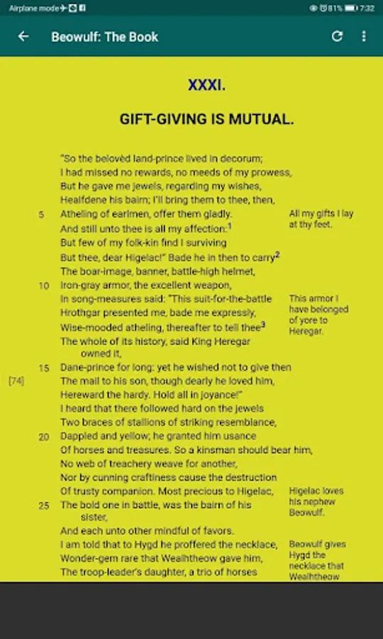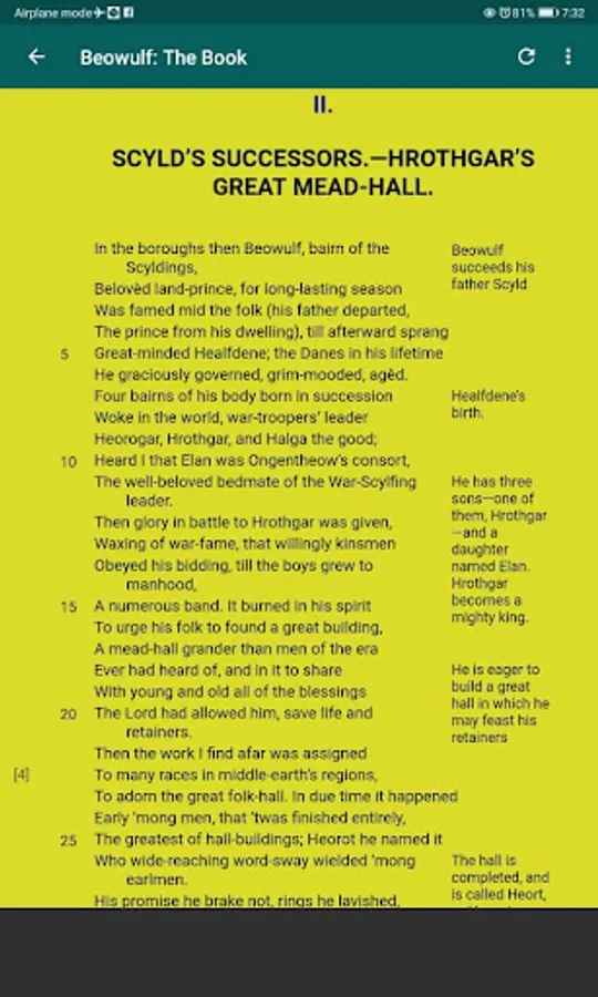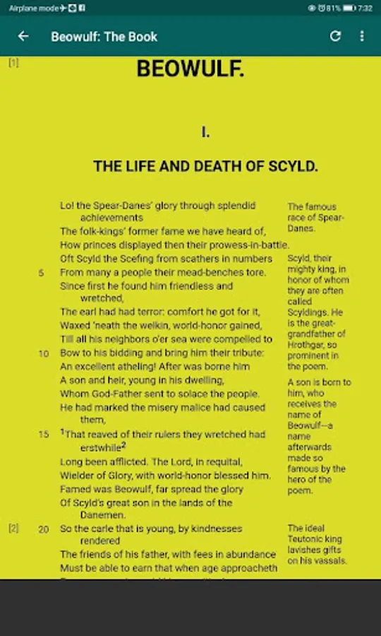 Beowulf: An Anglo-Saxon Poem is a free app for an Old English epic poem book consisting of about 3,182 alliterative lines. The book is one of the most important works of Old English literature. The date of composition is a matter of contention among scholars; the only certain dating pertains to the manuscript, which was produced between 975 and 1025. The poet remained anonymous and is being referred to as the "Beowulf poet" by scholars.