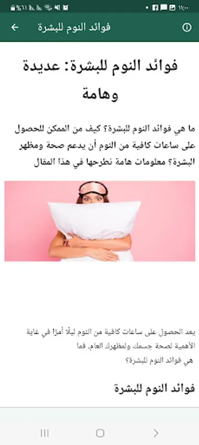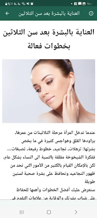 This application provides a large encyclopedia of all skin care and health methods and methods, presented to the user comfortably and smoothly, and the topic contains illustrations.
