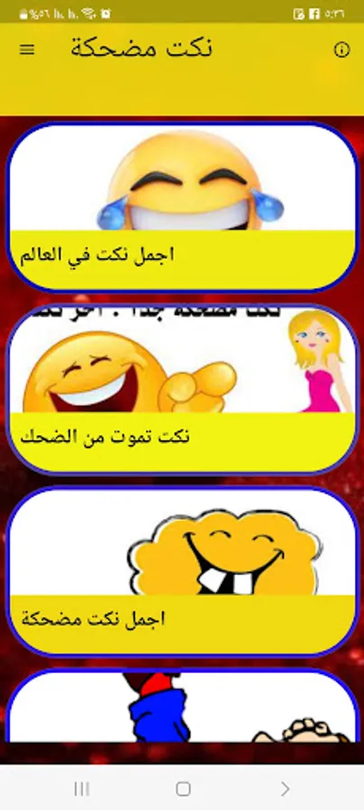 Si sientes que necesitas reírte mucho y divertirte, aquí tienes la نكت مضحكة بدون نت aplicación que incluye la mayor cantidad de los chistes graciosos más bonitos, hachís y entretenimientos entretenidos, una colección de chistes contundente y muy divertida, ahora puedes encontrarla en la aplicación نكت مضحكة بدون نت que puedes compartir y compartir la broma con tus seres queridos con facilidad, donde la aplicación se distingue por su diseño cómico y hermoso, no dudes en descargar la aplicación نكت مضحكة بدون نت y deseamos que pases el en el momento adecuado