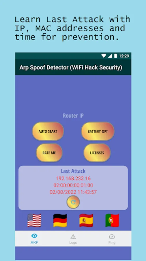 The languages English, German, Spanish, and Portuguese are all supported by ARP Spoof Detector.
