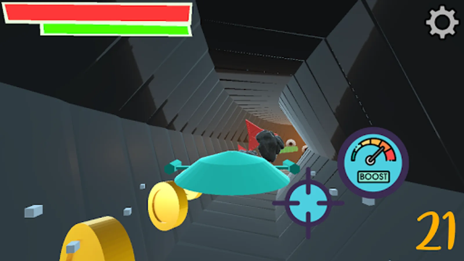 Tunnel Aviator is a space shooter where you have to shoot enemies and avoid obstacles in an endless generated tunnel to beat your personal highscore. Collecting coins, hearts and boosters might help you to achieve this faster.