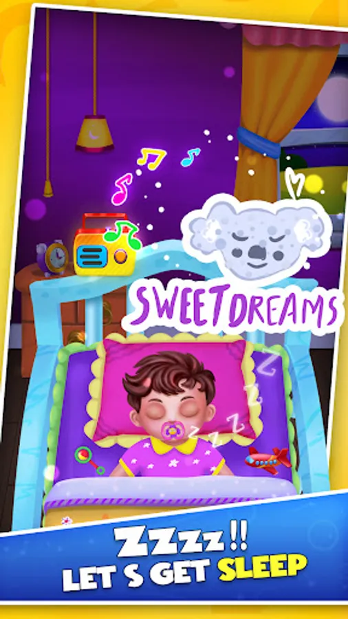 After a full day of activities, it's time for the baby to have a peaceful sleep. To make the baby sleep, turn off the light, turn on the lullaby music, pull up the blanket, and make sure the baby is asleep.
