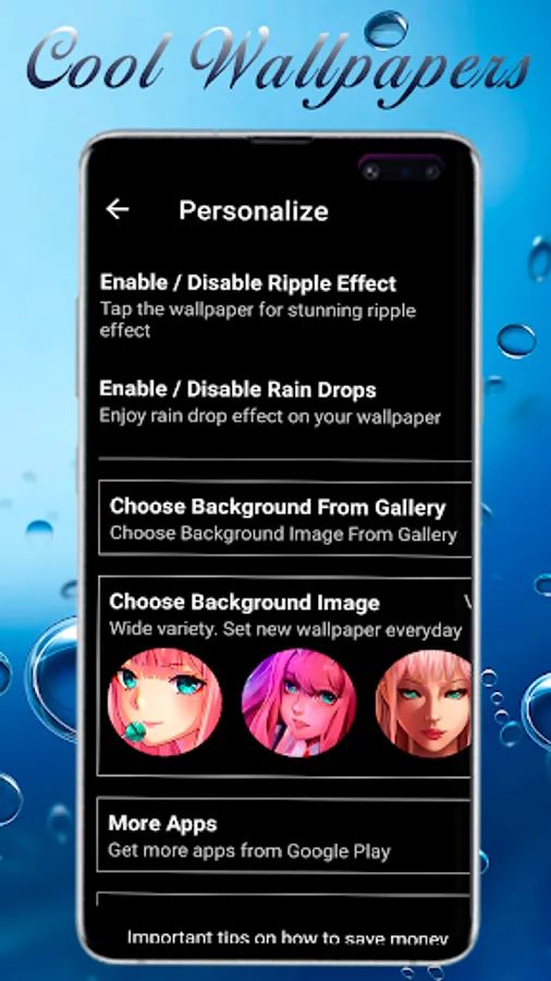 Now, if you need to change your style, you can just find a great example of cute, cool or kawaii girly, anime, teen, kpop, dope amd glitter 4K LIVE WALLPAPERS WITH WATER RIPPLE EFFECT here! You can customize this application very easily, without wasting battery charge and memory space!